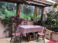 Woodstove. The house is a 1700s cottage with a garden that leads into the woods. It is on a quiet lane 10 mins cycle from Stroud centre.