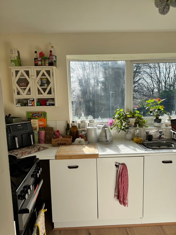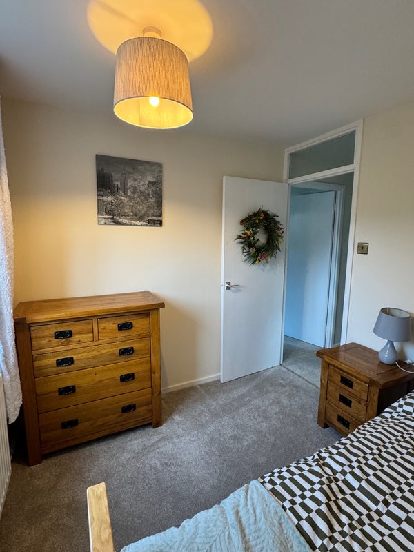 I am normally out of the house between 6am until 8pm most days. I can buy a new oak double wardrobe but there is a built in wardrobe in another room which is not used and has an additional chest of drawers in it. The room can be moved around however you want it.