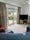 Bedroom with double bed, wardrobe, bedside cabinet with drawers, a table lamp and stool.