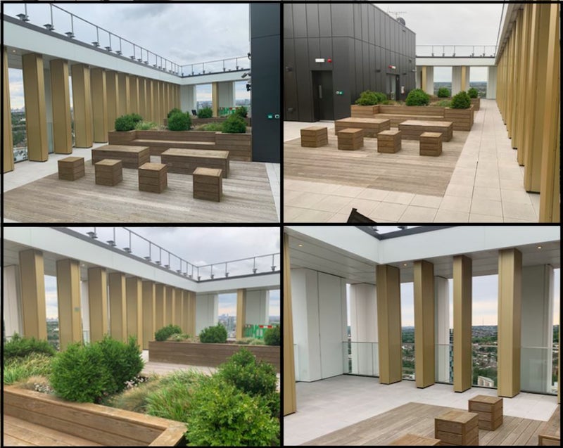 The flat also comes with secure access to roof terrace on 25th floor with wooden seating, planters and views in all directions.