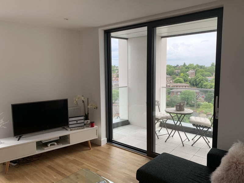 Large sliding door to private balcony with views looking towards Canary Wharf, City and Blackheath.