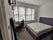 Fully furnished room with bed, desk with gaming chair and bed side table
