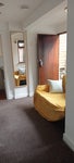 The room has a new sofa bed (4-foot wide) , a "Bistro" dining table and chairs, a fitted wardrobe and a chest of drawers.