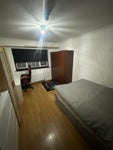 The room is fully furnished, featuring a double bed, wardrobe, desk, and chair—ideal for a working professional or student. Wooden flooring throughout and a clean, comfortable setup.