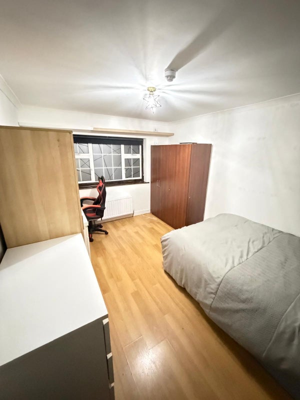 The room is fully furnished, featuring a double bed, wardrobe, desk, and chair—ideal for a working professional or student. Wooden flooring throughout and a clean, comfortable setup.