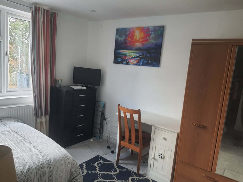 The room is on the first floor and comes fully furnished with a double bed, wardrobe, chest of drawers, bedside table, mirror, rug and curtains. Large double glazed windows make the room bright and airy with pleasant views. A modern bathroom is located right next to the room, and the property also offers a very good-sized, fully equipped kitchen with a washing machine, dishwasher, fridge freezer, oven, hob, microwave and plenty of storage. To ensure maximum comfort, there are two additional bathrooms and another kitchen, so you never have to queue. A huge living room is available on request for special occasions, and a beautiful rear garden provides a peaceful space for relaxing or drying clothes. Free fast broadband and free on street parking are included.