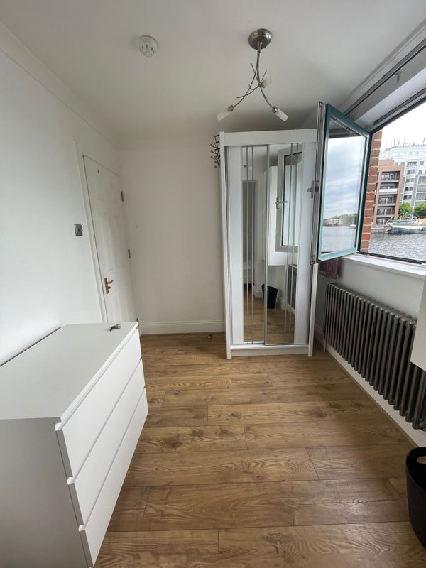 There is chest of drawers, wardrobe, walnut wood laminate flooring, newish bed 1 year old.. 2 good size windows opening onto the dock.