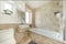 Living room and kitchen large open plan. Living room with 75 inch tv, three seater sofa and sliding doors leading to the big garden space. Kitchen new with loads of cabinets and utensils, quartz worktop, American style fridge freezer and other modern appliances.