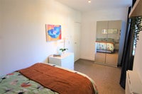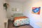 Room has a double bed with built in storage, a mirror doored double wardrobe with shelves & chest of drawers.