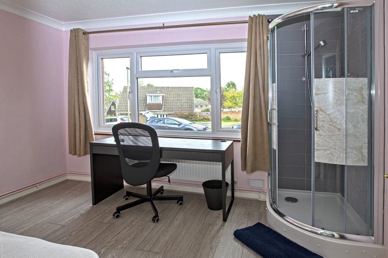 Downstairs large single room has its own in-built shower. The spacious shared living room with floor to ceiling windows overlooking the garden, as well as a modern kitchen facing the garden.