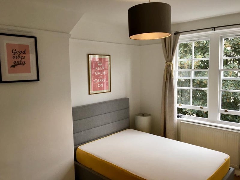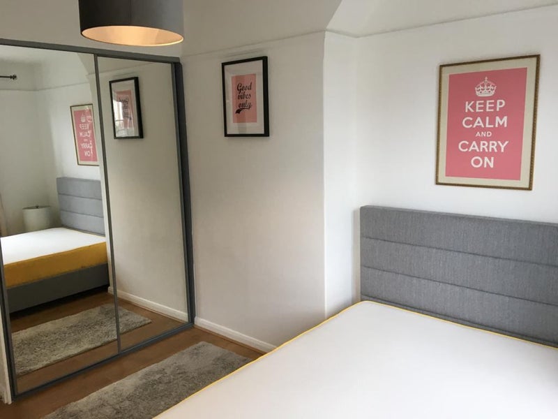 The room is the incredibly spacious (3m x 4m) and light-filled double master bedroom with a mirrored, built-in double wardrobe. The room has a Bensons For Beds bed, an Eve mattress and luxury John Lewis curtains.