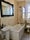Gorgeous recently refurbed bathroom, with rainfall double shower head, set off by baroque/rococo dramatic mirror and modern clear lampshade by John Lewis. Newly fitted stylish bathroom shelving takes care of all your storage needs.