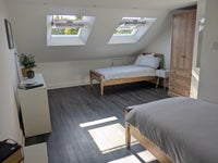 Large (20m2) bright, airy and quiet loft room, in a large 4 bedroom house with garden, backing onto a conservation area. Sole use of large modern bathroom with bath and shower adjacent to room.