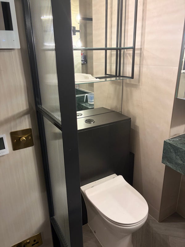* The Bathroom: Modern, private walk-in rainfall shower.