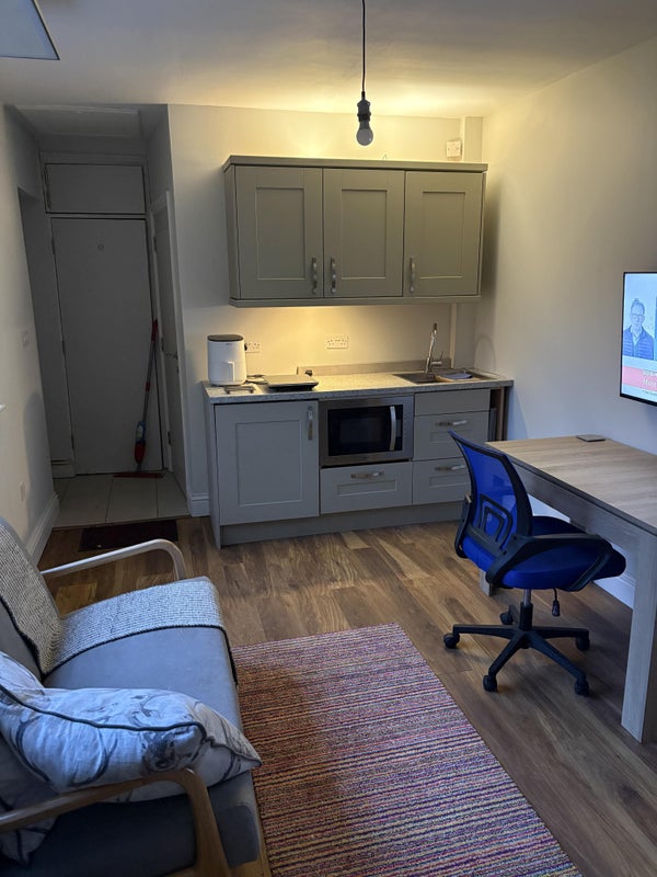 Quiet lleafy setting self contained newly decorated studio with onsite or street parking . Bills and fibre broadband included. Newly redecorated , new sofa ,table and TV. Air fryer, induction hob, microwave oven, new crockery and cutlery, and iron.