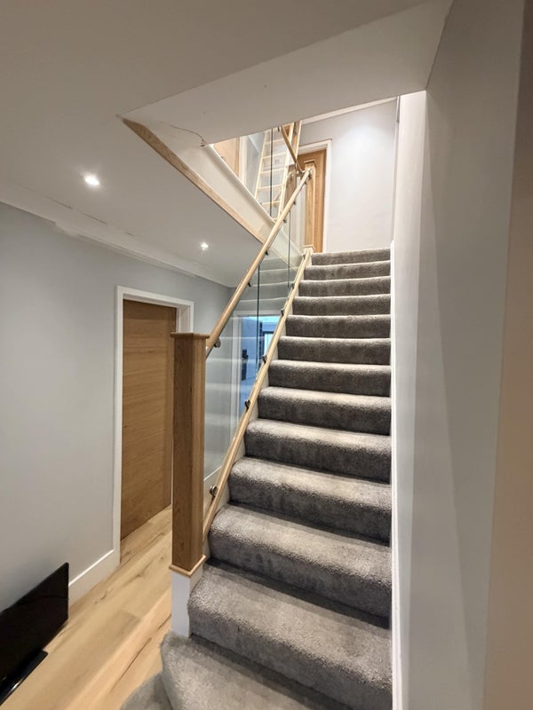 • High-End Finish: Sleek glass-balustrade staircase, polished marble-effect flooring, and contemporary oak doors.