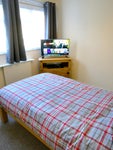 Medium-sized room with walk-in storage closet within a quiet friendly home. This room contains small double bed with side cabinet and chest of draws and a Smart TV and Superfast broadband.