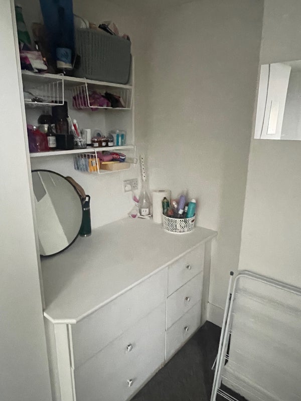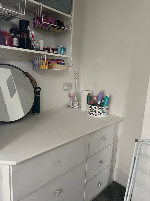 The room has a desk, wardrobe, chest of draws, bedside table and under bed storage.