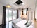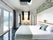 The room has two wardrobes, a desk and chair, mantel and regular shelf, patio window door and regular smaller window.