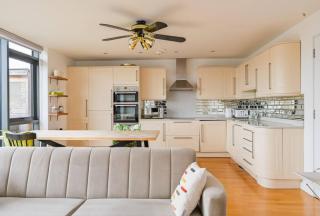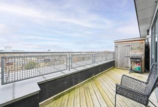 The property boasts an impressive open-plan living and kitchen area, flooded with natural light and offering direct access to a generous private roof terrace with far-reaching panoramic views, ideal for entertaining or relaxing. The well-proportioned layout extends to two spacious double bedrooms, both benefiting from floor-to-ceiling windows, enhancing the sense of light and space throughout. There are two high-specification bathrooms, including an en-suite and a Jack and Jill bathroom, along with a useful storage cupboard off the hallway.