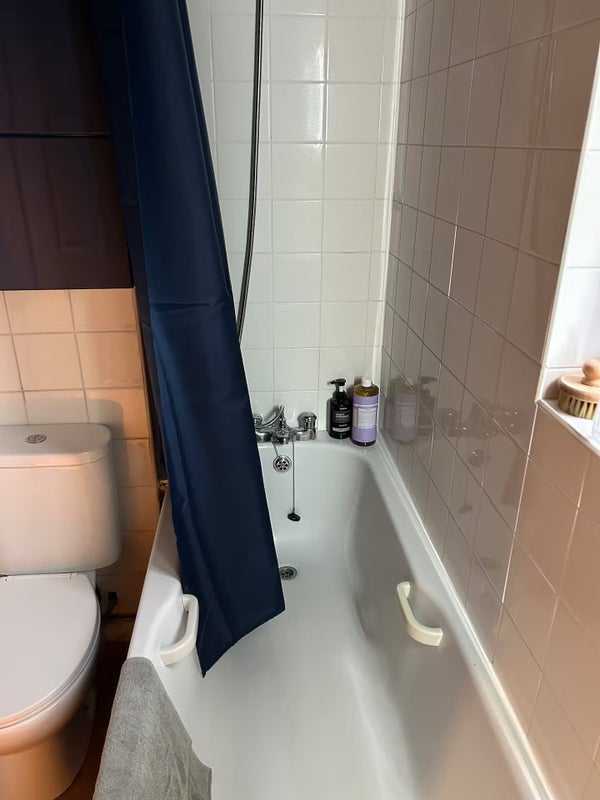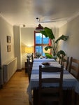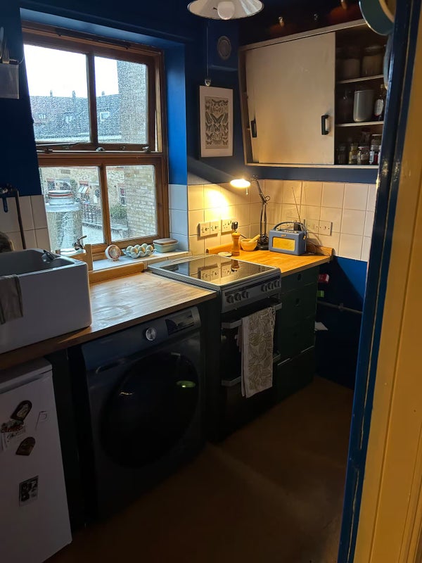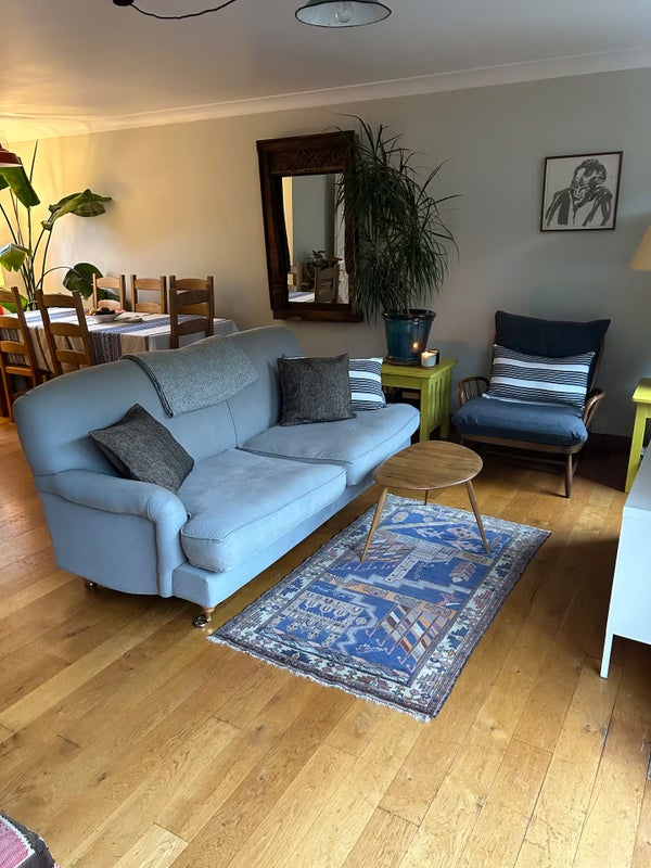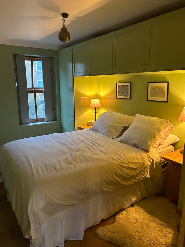 The flat has a lot of personality. The bedroom is painted in a beautiful deep sage green with warm, intimate lighting and built-in storage above the bed. The living room is calm and bright, with large French doors, warm oak floors, a big bookshelf and a relaxed workspace. The kitchen is bold and characterful, painted in a deep navy blue with wooden worktops, a Belfast sink and plenty of charm. The dining area is warm and welcoming, with a large table, a statement tropical plant and a lovely red-framed window that brings in the outside. Throughout, the decor is thoughtful and eclectic, this is a proper home, not a generic rental.