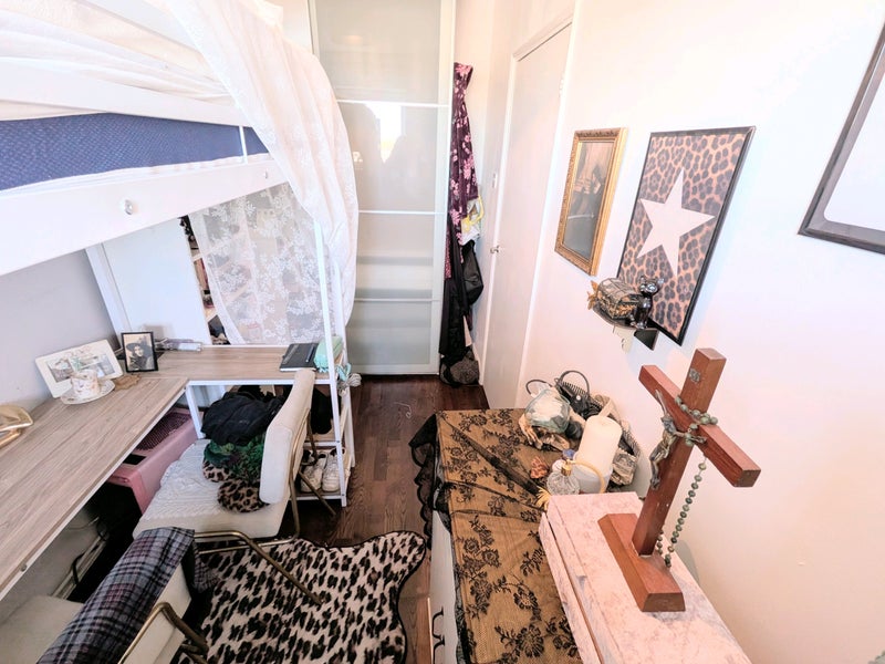 A cozy single room featuring a loft bed with a built-in desk underneath (staying in the room), making it ideal for someone who wants a functional, well-designed space. It's a calm spot to unwind, with great light and gorgeous views.