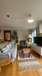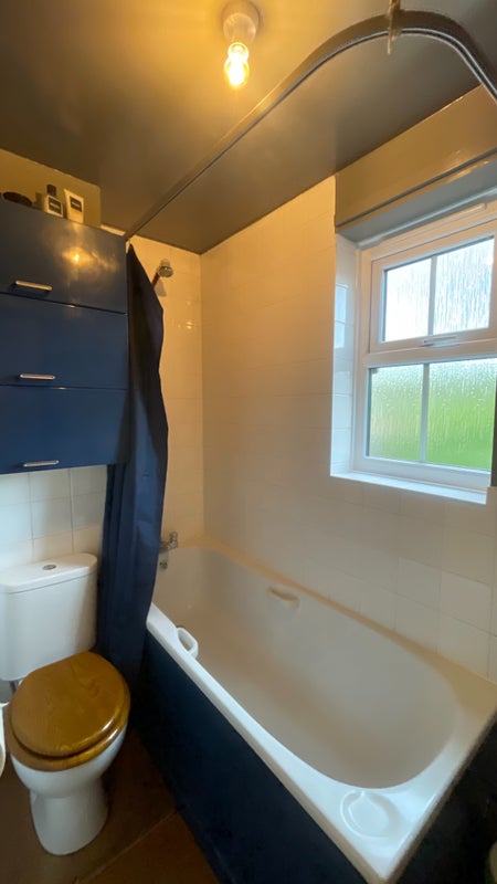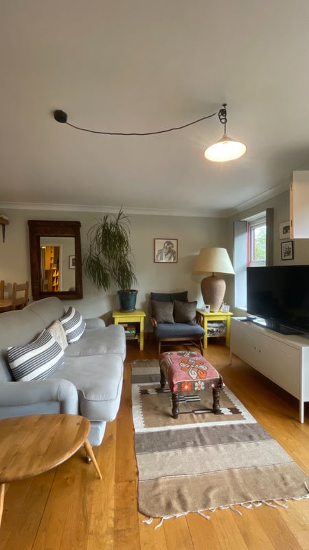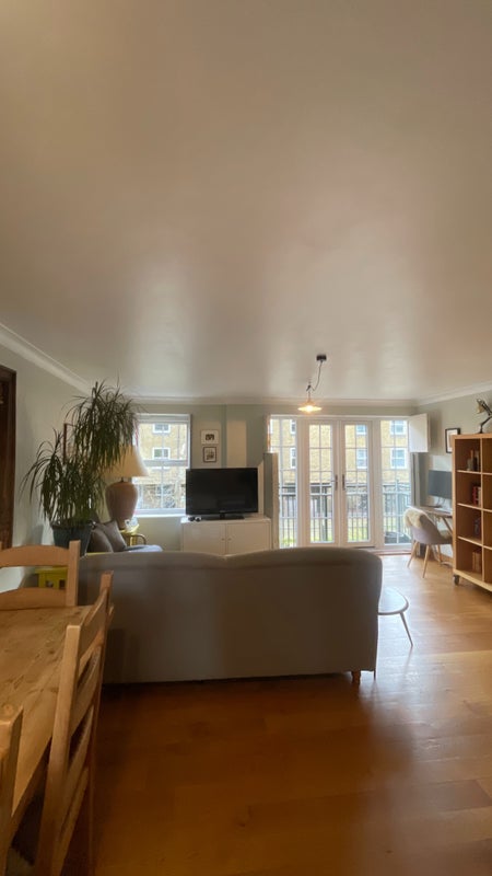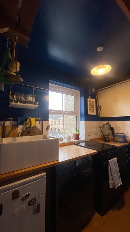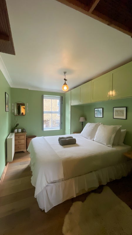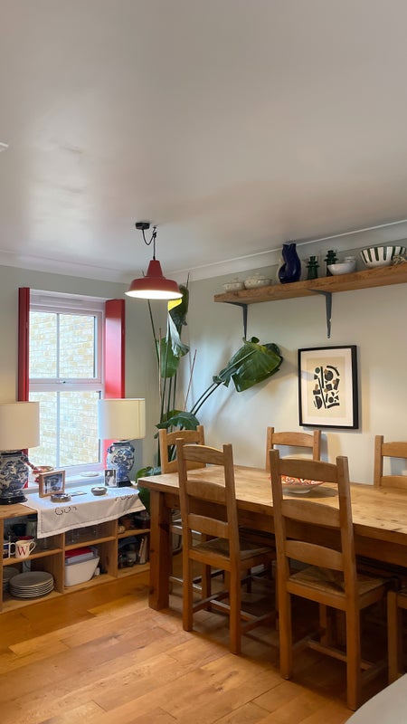 The flat has a lot of personality. The bedroom is painted in a beautiful deep sage green with warm, intimate lighting and built-in storage above the bed. The living room is calm and bright, with large French doors, warm oak floors, a big bookshelf and a relaxed workspace. The kitchen is bold and characterful, painted in a deep navy blue with wooden worktops, a Belfast sink and plenty of charm. The dining area is warm and welcoming, with a large table, a statement tropical plant and a lovely red-framed window that brings in the outside. Throughout, the decor is thoughtful and eclectic, this is a proper home, not a generic rental.