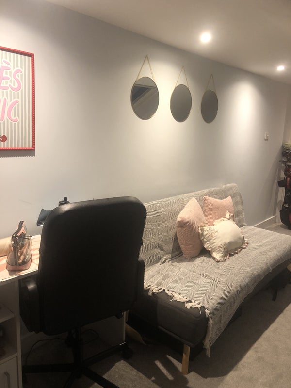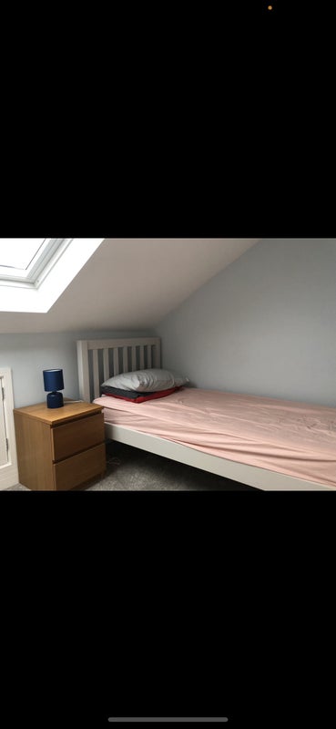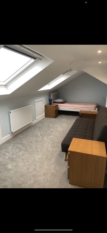 We are a family with 2 lovely young children, a boy aged 5 and a girl aged 3. This is a gorgeous room in our converted loft space. It is spacious with large built in shelves, a single bed, and a sofa bed, plus TV with wifi etc. There is a toilet/shower room you would have private use of. The room has2 large velux windows with black-out blinds. We’d welcome someone who is quiet and tidy, and understands that we have young children.