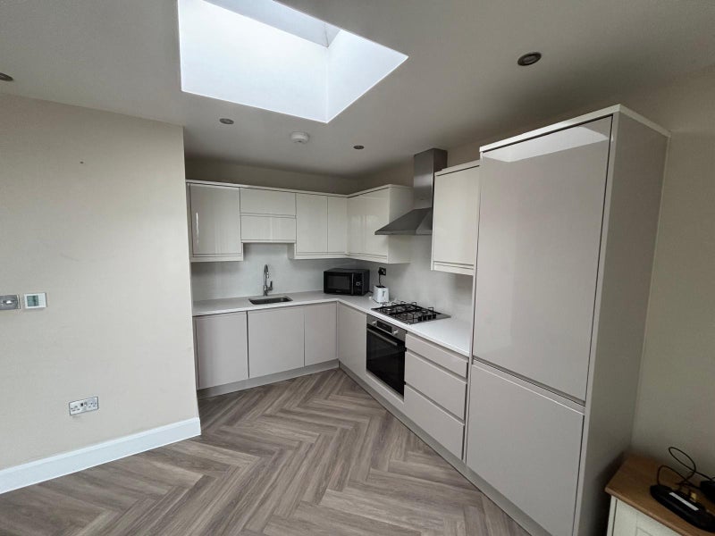 The sleek, fully fitted kitchen features integrated appliances and contemporary finishes, making it ideal for both everyday cooking and entertaining.