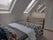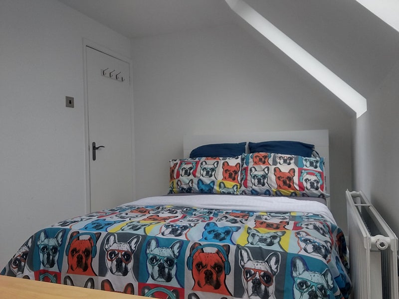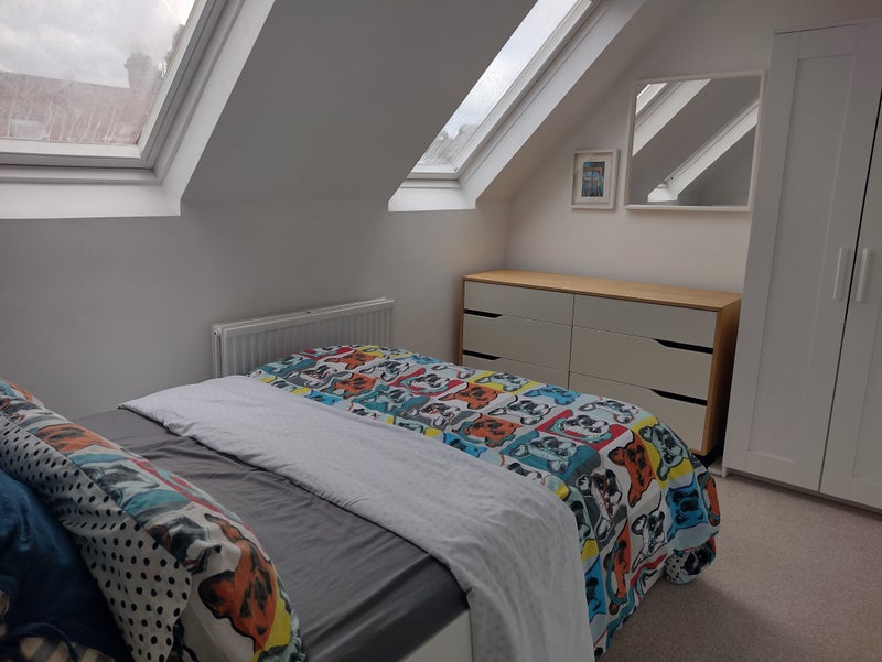 The bedroom has two Velux windows, fitted with blackout blinds. It is furnished with a wardrobe, large chest of drawers, and a standard double bed. There is storage space in the form of drawers under the bed, and shelves within the headboard. The flat also has a small loft space, where suitcases etc can be stored.
