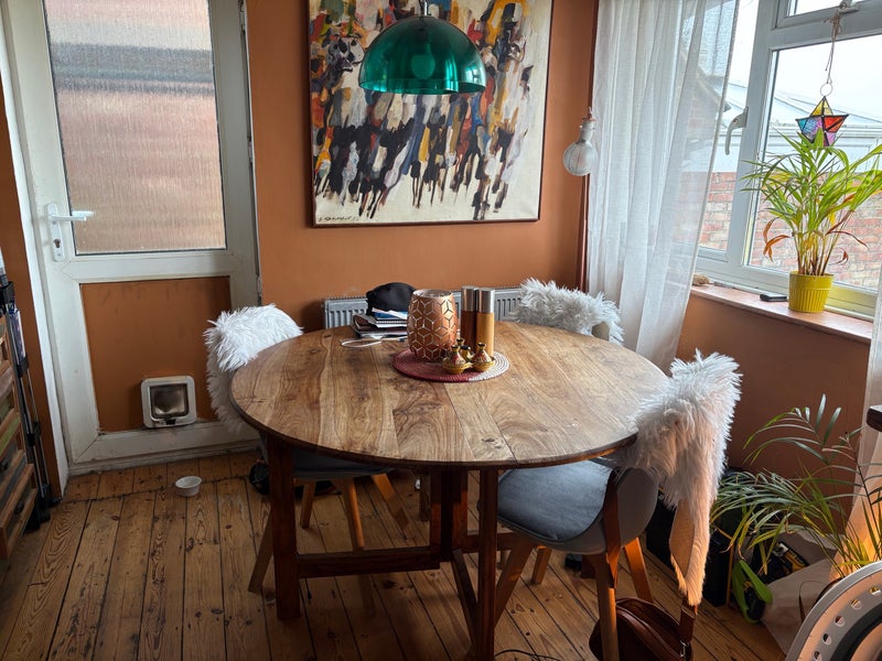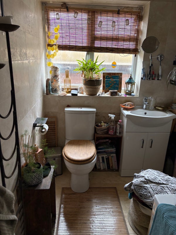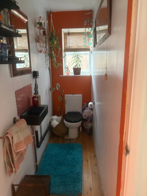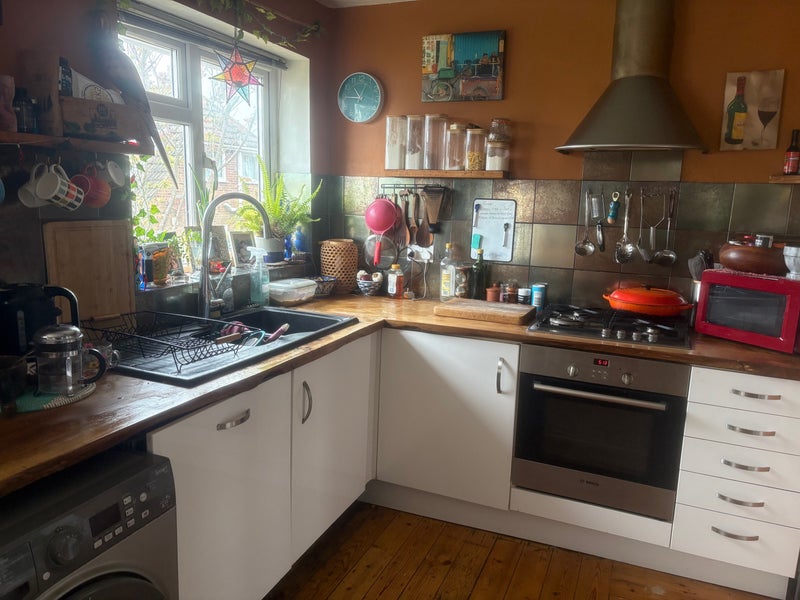 The kitchen is a good size and lodgers are welcome to use pans, plates etc. large table for eating. There is a downstairs toilet and a shared bathroom upstairs next to the room.