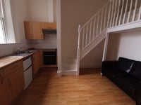Furnished split level bedsit with mezzanine sleeping area. Lower area is lounge area. Modern brand new kitchen with cooker and fridge. Stairs up to sleeping area. Bathroom is shared. Council tax and water rates are included.