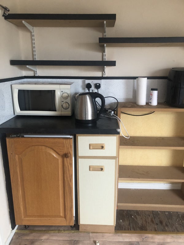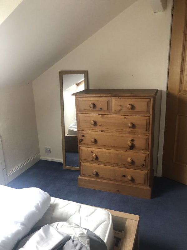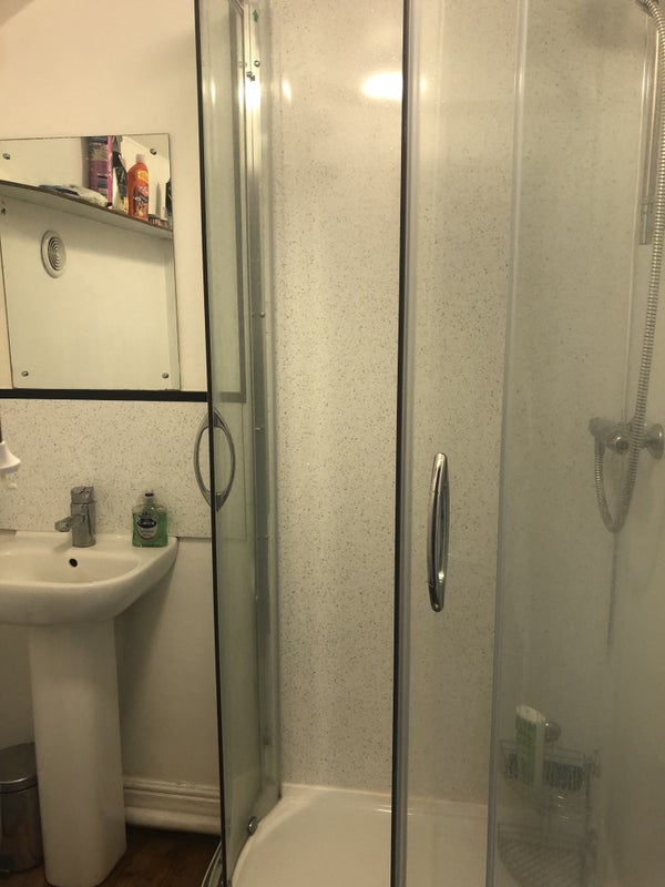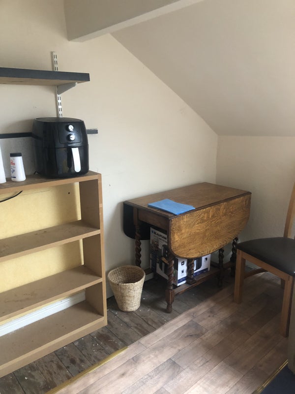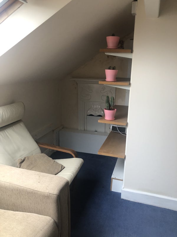 A self contained studio flat at top of a Victorian terraced house. It comprises a double bedroom with double bed, chest of drawers, bedside table and double wardrobe, a sitting room with dining table and 2 chairs, sofa, armchair and wall mounted TV. There is a separate shower bathroom and a small kitchen area in the living area with a microwave, kettle, toaster and a fridge. There is use of a full kitchen, including cooker, hob, dishwasher and washing machine.