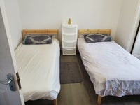 Two single beds, chest of drawers, wardrobe, bedside lamp, desk and chairs.