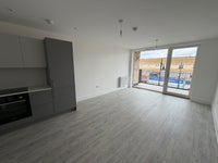 The property comprises a bright and well proportioned open plan kitchen and living area, finished with wood flooring and fully integrated appliances. The bedroom is generously sized, carpeted for comfort, and benefits from built-in storage.