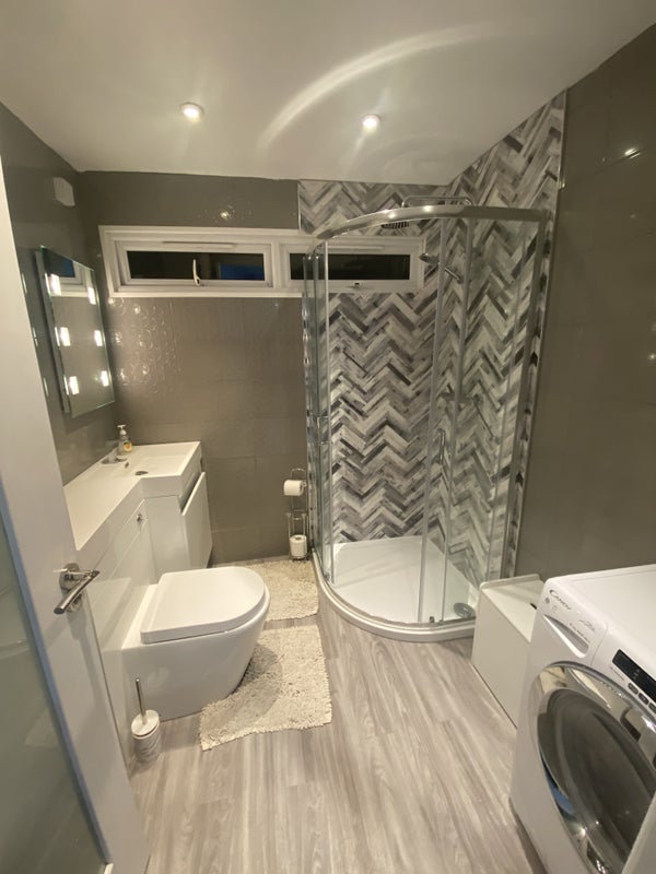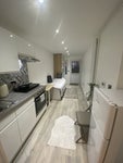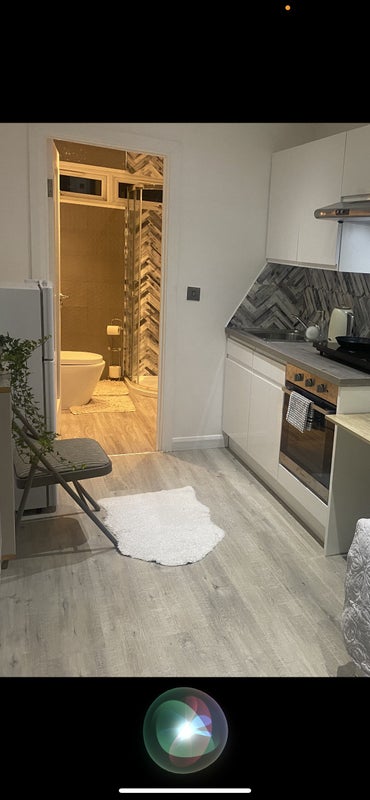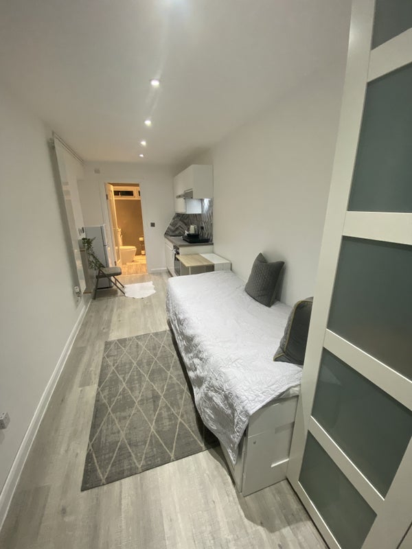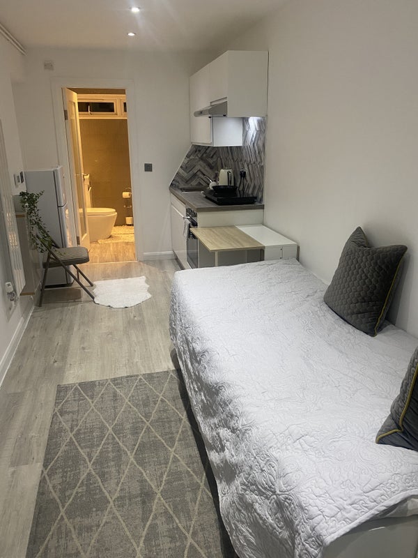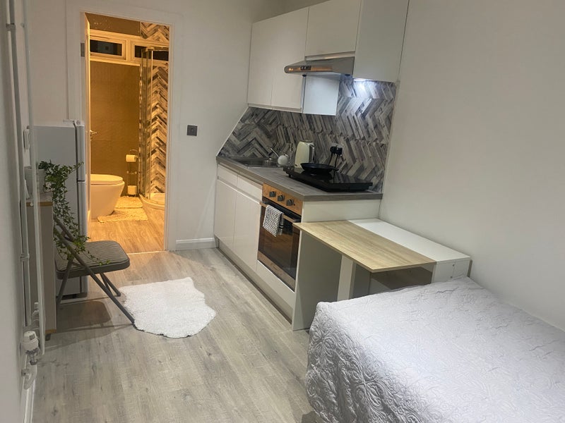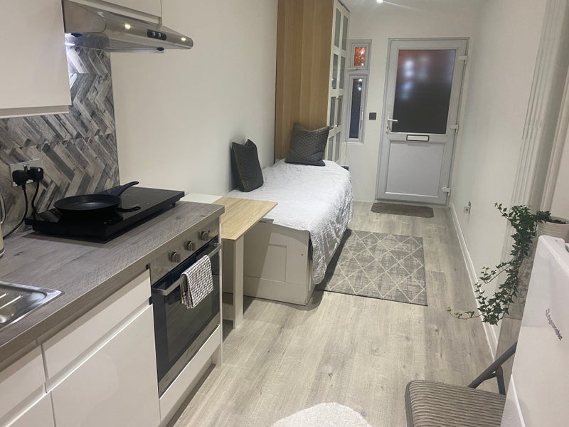 Studio in Loughton ideal for one person, kitchen, conventional oven, induction hob, single guest bed, opens into double with two drawers, wardrobe, central heating, fridge freezer, spacious bathroom, washer/dryer, excellent for a single person, very clean and modern. Short walk to Debden station, 3 mins walk to E15 acting school in Loughton. No pets allowed.
