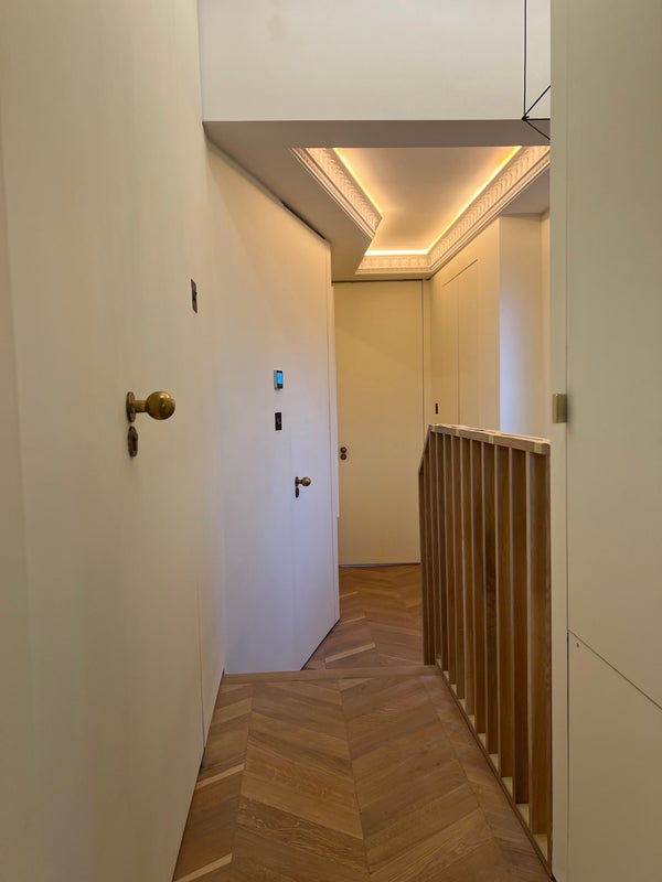 Property was recently renovated, newly sanded floors , new paint everywhere etc has its own private entrance .Parquet wood flooring through out , Open plan kitchen , living and dining with big TV. Kitchen has all the usual amenities. Underfloor heating through out . Bathroom on this floor has walk in shower ,storage behind the mirror & a heated towel rail. Washing machine/ dryer is in a cupboard in the hallway. The top floor has a separate bedroom with en-suite so the downstairs bathroom is only ever used by 2 people .