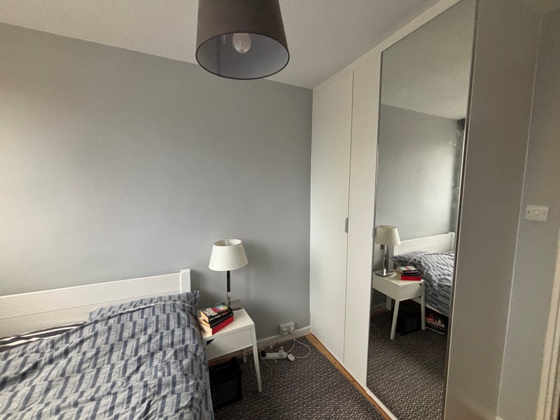 Large sunny bedroom with plenty of cupboard space and shared living room - wood floor through the whole flat