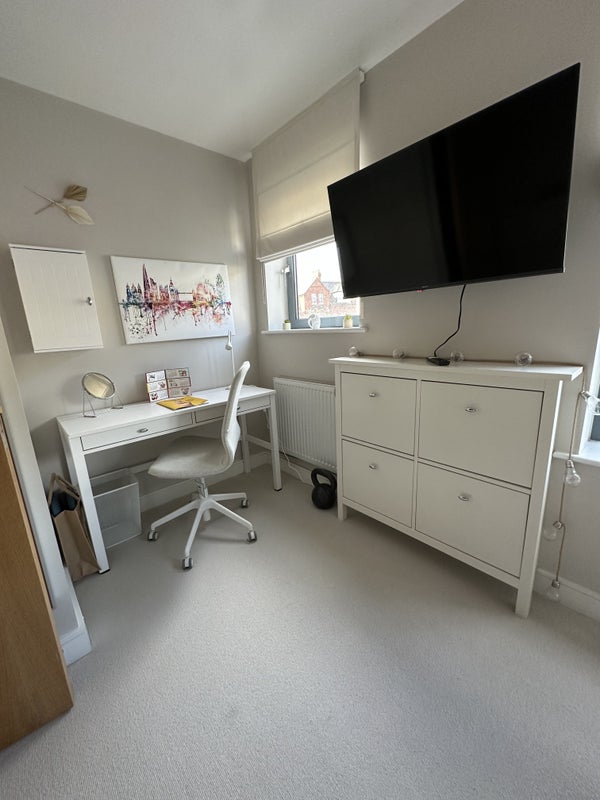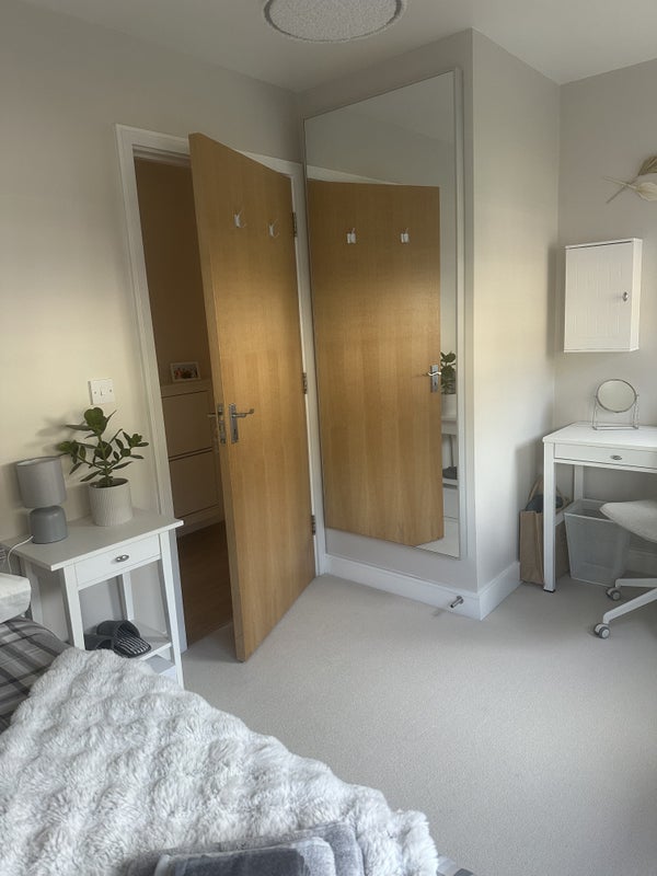The flat features a modern open-plan kitchen and living space. The bedroom includes a comfortable double bed, desk, and storage, with exclusive access to the family bathroom.