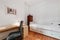 A great room with very comfortable Ikea bed with drawers underneath. There is a tall chest of drawers, a huge desk, chair, bookshelves, stripped pine floor boards and sturdy hanging rail for your clothes. The sash window has secondary glazing so it's a very quiet room.