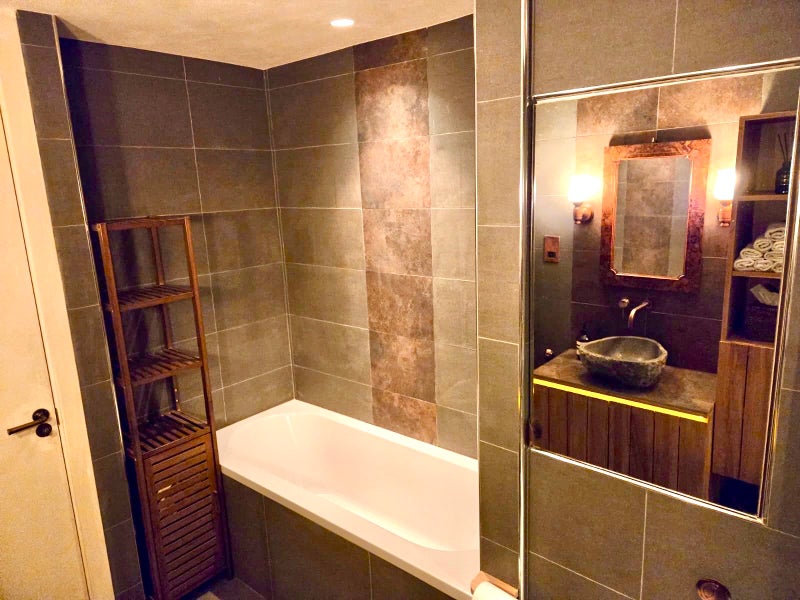 • Luxury bathroom with bathtub and separate shower, featuring teak vanity, pebble stone sink, and handmade copper shower head
