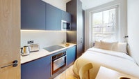 The Studio apartments are cosy, fully furnished with fitted wardrobe and kitchen dining table. The full spec kitchen includes a 4 x ring convection hob, fan oven, under counter fridge, microwave and integrated washer/dryer. As well as a comfortable double bed, the bathroom is finished to a high spec complete with rain shower and black metallic finishes throughout. All utility bills are included in monthly rent, plus regular professional cleaning.
