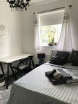 Equipped with a double bed with bedding if required, desk and chair, large tv, huge wardrobe with drawers, microwave, toaster, and kettle. Bedside drawer and light. Situated at the rear of the property.