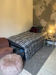A clean, nicely decorated double room available in a welcoming home, living with a professional landlady who works from home and her very friendly small French bulldog.