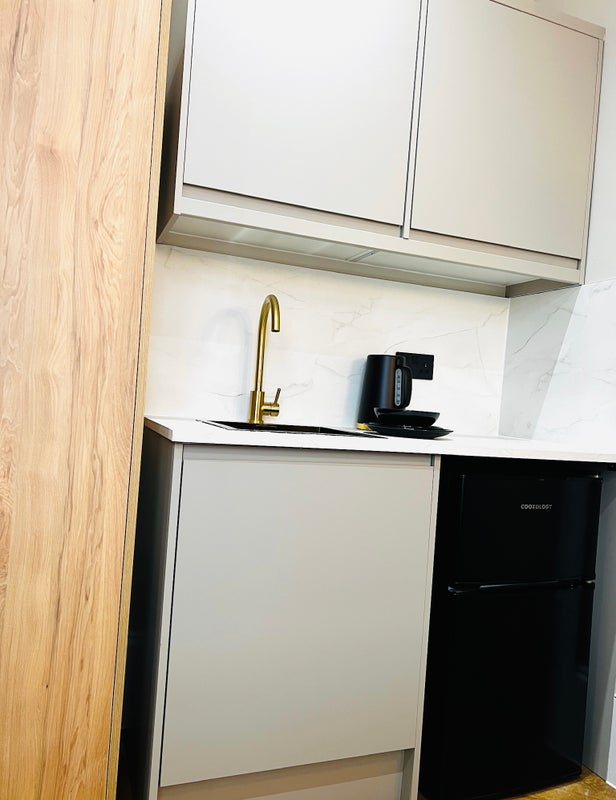 Each room has its own private en-suite bathroom and a personal area with sink, storage, tea station, and fridge freezer. Keep your food private, handle daily prep in your room, and use the shared kitchen when you want to cook a full meal.