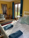 The main sleeping/sitting room has a comfortable double bed, small sofa, table and chairs plus clothes hanging space and a dresser.