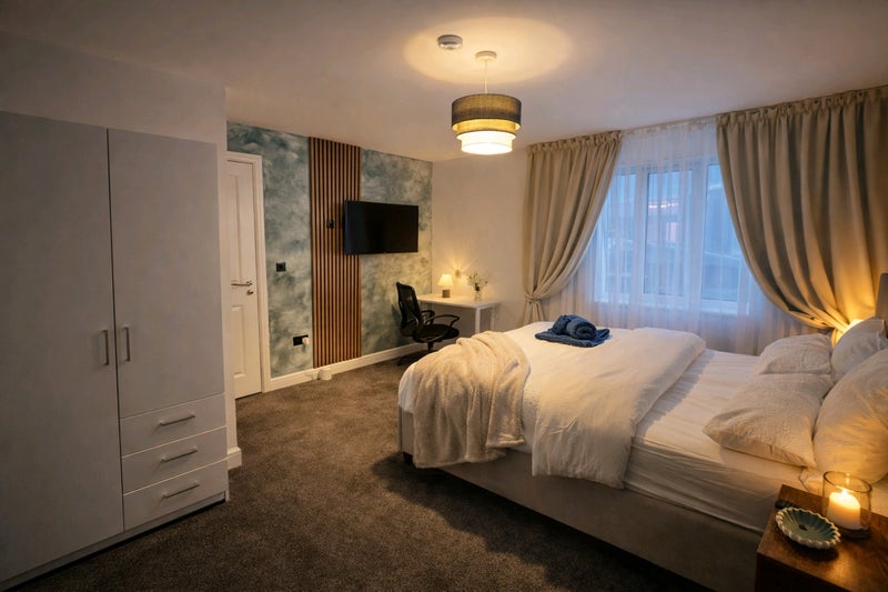 • Fully furnished rooms (double bed, wardrobe, desk/storage)