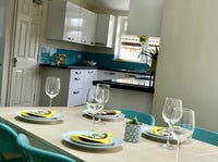 There is a fully fitted kitchen/diner. The kitchen has lots of storage. There are two fridge freezers, two hobs, oven, dishwasher, and a convector microwave. The dining area has a large table and chairs.