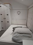 Newly decorated and furnished double bedroom in semi-detached four bedroom house-share located on quiet cul-de-sac in sough-after Kidlington. Only 0.4 miles from Bus Stops, 0.8 miles from High Street, 1.3 miles from Oxford Parkway Station, 5 miles from Oxford City Centre. All bills included, private bathroom, private house and garden access, shared downstairs kitchen facilities, wardrobe, desk, chair and four-poster double bed. Our last lounger was with us over 2 years and references are available upon request.