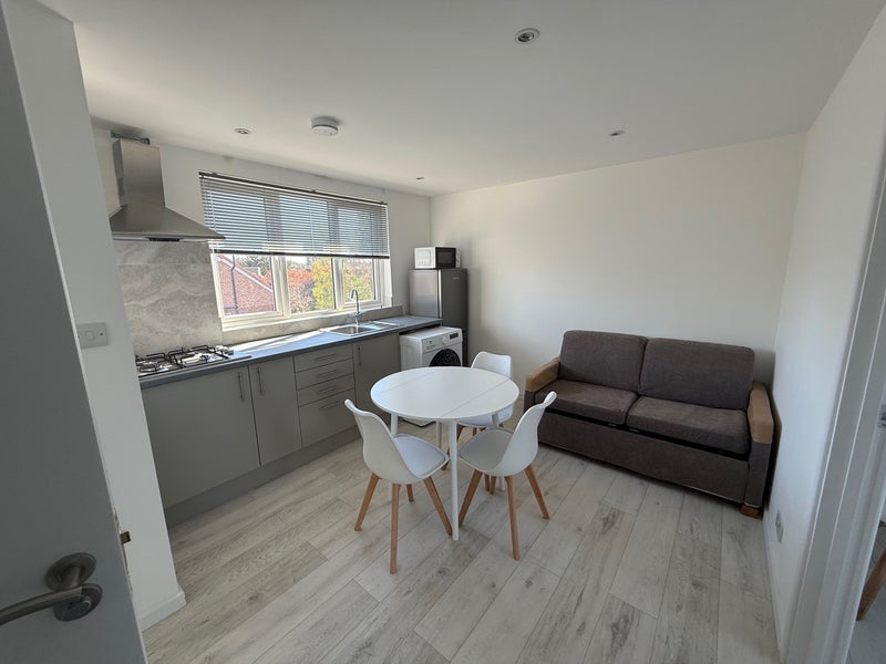 The flat includes a comfortable double bed and single bed, a wardrobe, a chest of drawers, a desk, a chair, and a two-seater sofa, ideal for professionals or students.